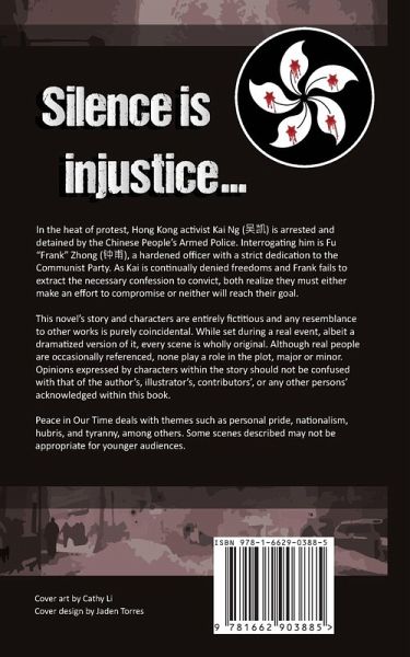 In the heat of protest, Hong Kong activist Kai Ng (??) is arrested and detained by the Chinese People's Armed Police. Interrogating him is Fu "Frank" Zhong (??), a hardened officer with a strict dedication to the Communist Party. As Kai is continually denied freedoms and Frank fails to extract the necessary confession to convict, both realize they must either make an effort to compromise or neither will reach their goal. This novel's story and characters are entirely fictitious and any resemblance to other works is purely coincidental. While set during a real event, albeit a dramatized version of it, every scene is wholly original. Although real people are occasionally referenced, none play a role in the plot, major or minor. Opinions expressed by characters within the story should not be confused with that of the author's, illustrator's, contributors', or any other persons' acknowledged within this book. Peace in Our Time deals with themes such as personal pride, nationalism, hubris, and tyranny, among others. Some scenes described may not be appropriate for younger audiences.