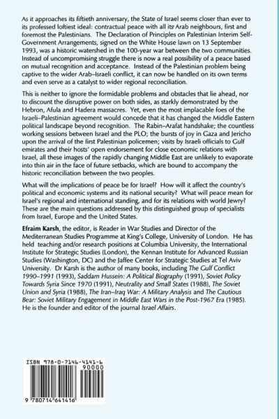 Peace by the end of the century? - a personal gloss on the Arab-Israeli Peace Process, P.J. Vatikiotis peace and Israeli security, Dov S. Zakheim the diaspora and the Peace Process, Max Beloff the boundaries of peace, Moshe Brawer reassessing the US-Israeli special relationship, Bernard Reich the effects of the peace on the Israeli economy, Ben-Zion Zilberfarb new directions in Israel's foreign policy, Aharon Klieman the politics of Israeli-European economic relations, Rosemary Hollis Jewish settlements in the West Bank - past, present and future, Elisha Efrat Israeli professionals and the Peace Process, Michael Keren.