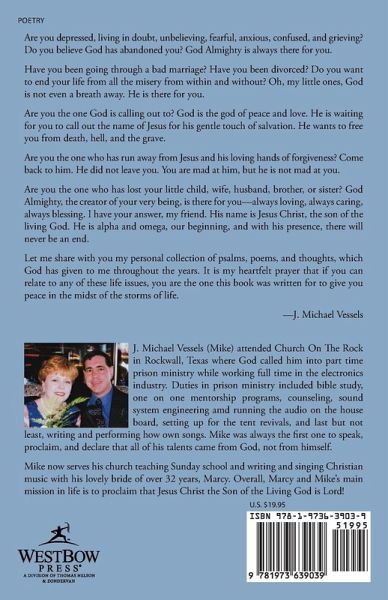 Are you depressed, living in doubt, unbelieving, fearful, anxious, confused, and grieving? Do you believe God has abandoned you? God Almighty is always there for you. Have you been going through a bad marriage? Have you been divorced? Do you want to end your life from all the misery from within and without? Oh, my little ones, God is not even a breath away. He is there for you. Are you the one God is calling out to? God is the god of peace and love. He is waiting for you to call out the name of Jesus for his gentle touch of salvation. He wants to free you from death, hell, and the grave. Are you the one who has run away from Jesus and his loving hands of forgiveness? Come back to him. He did not leave you. You are mad at him, but he is not mad at you. Are you the one who has lost your little child, wife, husband, brother, or sister? God Almighty, the creator of your very being, is there for you-always loving, always caring, always blessing. I have your answer, my friend. His name is Jesus Christ, the son of the living God. He is alpha and omega, our beginning, and with his presence, there will never be an end. Let me share with you my personal collection of psalms, poems, and thoughts, which God has given to me throughout the years. It is my heartfelt prayer that if you can relate to any of these life issues, you are the one this book was written for to give you peace in the midst of the storms of life. -J. Michael Vessels