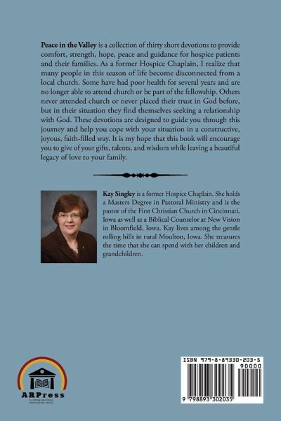 Peace in the Valley is a collection of thirty short devotions to provide comfort, strength, hope, peace and guidance for hospice patients and their families. As a former Hospice Chaplain, I realize that many people in this season of life become disconnected from a local church. Some have had poor health for several years and are no longer able to attend church or be part of the fellowship. Others never attended church or never placed their trust in God before, but in their situation they find themselves seeking a relationship with God. These devotions are designed to guide you through this journey and help you cope with your situation in a constructive, joyous, faith-filled way. It is my hope that this book will encourage you to give of your gifts, talents, and wisdom while leaving a beautiful legacy of love to your family.