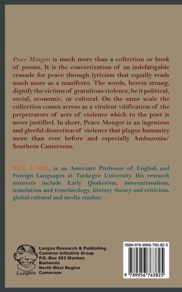 Peace Mongers is much more than a collection or book of poems. It is the concretization of an indefatigable crusade for peace through lyricism that equally reads much more as a manifesto. The words, herein strung, dignify the victims of gratuitous violence, be it political, social, economic, or cultural. On the same scale the collection comes across as a virulent vilification of the perpetrators of acts of violence which to the poet is never justified. In short, Peace Monger is an ingenious and gleeful dissection of violence that plague humanity more than ever before and especially Ambazonia/Southern Cameroons.