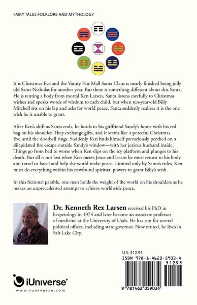 It is Christmas Eve and the Vanity Fair Mall Santa Claus is nearly finished being jolly old Saint Nicholas for another year. But there is something different about this Santa. He is renting a body from mortal Ken Larsen. Santa listens carefully to Christmas wishes and speaks words of wisdom to each child, but when ten-year-old Billy Mitchell sits on his lap and asks for world peace, Santa suddenly realizes it is the one wish he is unable to grant. After Ken's shift as Santa ends, he heads to his girlfriend Sandy's home with his red bag on his shoulder. They exchange gifts, and it seems like a peaceful Christmas Eve until the doorbell rings. Suddenly Ken finds himself precariously perched on a dilapidated fire escape outside Sandy's window-with her jealous husband inside. Things go from bad to worse when Ken slips on the icy platform and plunges to his death. But all is not lost when Ken meets Jesus and learns he must return to his body and travel to Israel and help the world make peace. Limited only by Santa's rules, Ken must do everything within his newfound spiritual powers to grant Billy's wish. In this fictional parable, one man holds the weight of the world on his shoulders as he makes an unprecedented attempt to achieve worldwide peace.