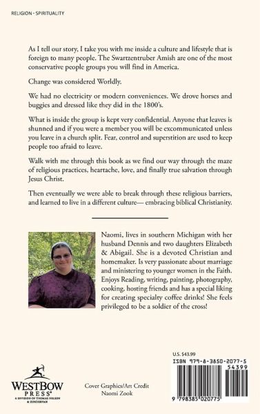 As I tell our story, I take you with me inside a culture and lifestyle that is foreign to many people. The Swartzentruber Amish are one of the most conservative people groups you will find in America. Change was considered Worldly. We had no electricity or modern conveniences. We drove horses and buggies and dressed like they did in the 1800's. What is inside the group is kept very confidential. Anyone that leaves is shunned and if you were a member you will be excommunicated unless you leave in a church split. Fear, control and superstition are used to keep people too afraid to leave. Walk with me through this book as we find our way through the maze of religious practices, heartache, love, and finally true salvation through Jesus Christ. Then eventually we were able to break through these religious barriers, and learned to live in a different culture- embracing biblical Christianity.