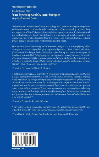 Section I: Foundations Across the Levels of Peace.- Chapter 1: A Foundation for the Integration of Peace Psychology and Character Strengths: New Science, Emerging Practices.- Chapter 2: Inner Peace and Character Strengths.- Chapter 3: Relational Peace and Character Strengths.- Chapter 4: Intragroup Peace and Character Strengths.- Chapter 5: Intergroup Peace and Character Strengths.- Chapter 6: Community Peace and Character Strengths.- Chapter 7: International Peace and Character Strengths.- Chapter 8: Ecological Peace and Character Strengths.- Section II: Specific Character Strengths to Create Peace.- Chapter 9: Perspective and Curiosity for Peace.- Chapter 10: Courage for Peace.- Chapter 11: Kindness for Peace.- Chapter 12: Justice and Fairness for Peace.- Chapter 13: Humility and Forgiveness for Peace.- Chapter 14: Hope, Gratitude, and Love for Peace.- Chapter 15: Spirituality for Peace.- Section III: The Future: Character Strengths and Peace.- Chapter 16: A Barrierless World: Character Strengths and Peaceful Steps Toward Global Harmony.- Chapter 17: Conclusion: An Integration of the Integration of Peace and Character Strengths.