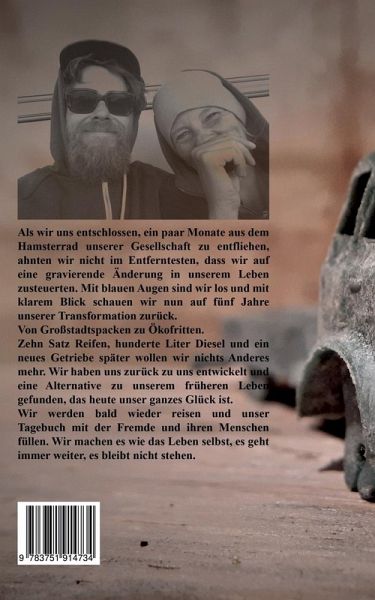 Als wir uns entschlossen, ein paar Monate aus dem Hamsterrad unserer Gesellschaft zu entfliehen, ahnten wir nicht im entferntesten, dass wir auf eine gravierende Änderung in unserem Leben zu steuerten. Mit blauen Augen sind wir los, und mit klarem Blick schauen wir nun auf fünf Jahre unserer Transformation zurück. Von Großstadtspacken zu Ökofritten. Zehn Satz Reifen, hunderte Liter Diesel und ein neues Getriebe später wollen wir nichts anderes mehr. Wir haben uns zurück zu uns entwickelt und eine Alternative zu unserem früheren Leben gefunden, das heute unser ganzes Glück ist. Wir werden bald wieder reisen und unser Tagebuch mit der Fremde und ihren Menschen füllen. Wir machen es wie das Leben selbst, es geht immer weiter, es bleibt nicht stehen.