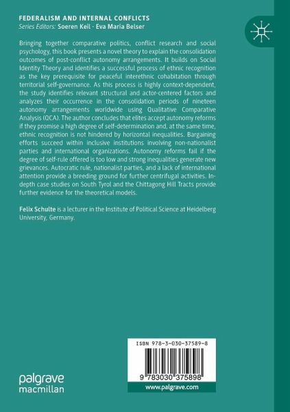 Bringing together comparative politics, conflict research and social psychology, this book presents a novel theory to explain the consolidation outcomes of post-conflict autonomy arrangements. It builds on Social Identity Theory and identifies a successful process of ethnic recognition as the key prerequisite for peaceful interethnic cohabitation through territorial self-governance. As this process is highly context-dependent, the study identifies relevant structural and actor-centered factors and analyzes their occurrence in the consolidation periods of nineteen autonomy arrangements worldwide using Qualitative Comparative Analysis (QCA). The author concludes that elites accept autonomy reforms if they promise a high degree of self-determination and, at the same time, ethnic recognition is not hindered by horizontal inequalities. Bargaining efforts succeed within inclusive institutions involving non-nationalist parties and international organizations. Autonomy reforms fail if thedegree of self-rule offered is too low and strong inequalities generate new grievances. Autocratic rule, nationalist parties, and a lack of international attention provide a breeding ground for further centrifugal activities. In-depth case studies on South Tyrol and the Chittagong Hill Tracts provide further evidence for the theoretical models.