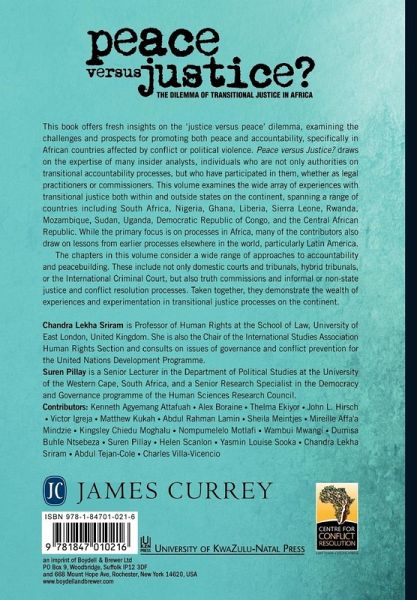 Introduction: Transitional Justice & Peacebuilding - Chandra Lekha Sriram Part I: Peace & Justice in Africa Peace & the Politics of Justice in Africa - Yasmin Sooka Inclusive Justice: The Limitations of Trial Justice & Truth Commissions - Charles Villa-Vicencio Prosecute or Pardon? Between Truth Commissions & War Crimes Trials - Kingsley Chiedu Moghalu Gender & Truth & Reconciliation Commissions: Comparative Reflections - Sheila Meintjes Transitional Justice, Democratisation & the Rule of Law - Mireille Affa'a Mindzie Part II: Truth & Reconciliation Processes Peace versus Justice: Truth & Reconciliation Commissions & War Crimes Tribunals in Africa - Alex Boraine Reflecting on the Sierra Leone Truth & Reconciliation: A Peacebuilding Perspective - Thelma Ekiyor Peace versus Justice? A View from Nigeria - Mathew Kukah A Path to Peace: Ghana & the National Reconciliation Commission - Kenneth Ageymang Attafuah Peace & Justice: Mozambique & Sierra Leone Compared - John Hirsch Part III: War Crimes Tribunals Sierra Leone's 'not so' Special Court - Abdul Tejan-Cole Charles Taylor & the Special Court for Sierra Leone: Politics, Interests & Agendas - Abdul Rahman Lamin The International Criminal Tribunal for Rwanda: Reconciling the Acquitted - Wambui Mwangi Part IV: Indigenous Justice The Politics of Peace, Justice & Healing in Post-war Mozambique 'Practices of Rapture' by Magamba Spirits & Healers in Gorongosa - Victor Igreja Indigenous Justice or Political Instrument? The Modern Gacaca Courts of Rwanda - Helen Scanlon Indigenous Justice or Political Instrument? The Modern Gacaca Courts of Rwanda - Nompumelelo Motlafi Part V The International Criminal Court: Problems & Prospects The International Criminal Court Africa Experiment: The Central African Republic, Darfur, Northern Uganda & the Democratic Republic of the Congo - Chandra Lekha Sriram The International Criminal Court in Darfur - Dumisa Ntsebeza Conclusion - Suren Pillay