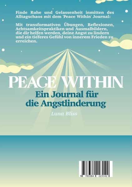 "Peace Within: Ein Journal für die Angstlinderung"!In diesem liebevoll gestalteten Journal findest du eine Vielzahl von praktischen Übungen, die dir helfen, deine Angst zu lindern und inneren Frieden zu finden. Tauche ein in eine Welt der Selbstreflexion und Achtsamkeit, während du durch inspirierende Reflexionsübungen geführt wirst, um deine Gedanken und Gefühle zu erkunden. Verwende unsere Achtsamkeitsübungen, um dich im Hier und Jetzt zu verankern und deine Sinne zu schärfen. Entspanne dich mit beruhigenden Ausmalbildern, die dir helfen, Stress abzubauen und deine Kreativität zu entfalten. Erfahre Erdungsübungen, die dir helfen, dich mit der Natur zu verbinden und ein Gefühl von Stabilität und Sicherheit zu erlangen. Mit "Peace Within" kannst du jeden Tag einen kleinen Schritt auf dem Weg zu mehr innerer Ruhe und Ausgeglichenheit machen. Lass uns gemeinsam diesen Weg der Selbstheilung und persönlichen Entwicklung gehen.