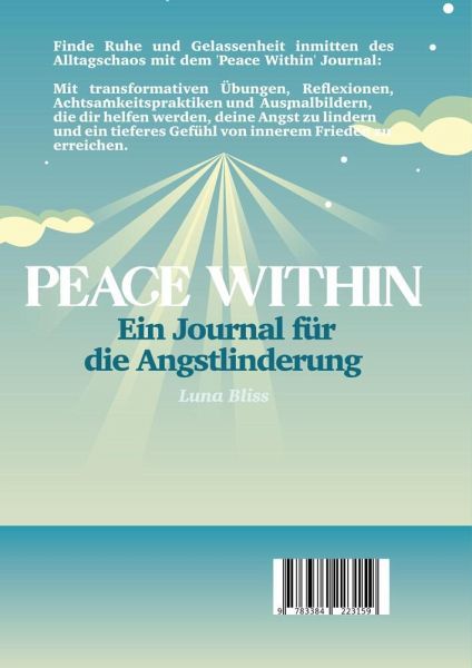 "Peace Within: Ein Journal für die Angstlinderung"!In diesem liebevoll gestalteten Journal findest du eine Vielzahl von praktischen Übungen, die dir helfen, deine Angst zu lindern und inneren Frieden zu finden. Tauche ein in eine Welt der Selbstreflexion und Achtsamkeit, während du durch inspirierende Reflexionsübungen geführt wirst, um deine Gedanken und Gefühle zu erkunden. Verwende unsere Achtsamkeitsübungen, um dich im Hier und Jetzt zu verankern und deine Sinne zu schärfen. Entspanne dich mit beruhigenden Ausmalbildern, die dir helfen, Stress abzubauen und deine Kreativität zu entfalten. Erfahre Erdungsübungen, die dir helfen, dich mit der Natur zu verbinden und ein Gefühl von Stabilität und Sicherheit zu erlangen. Mit "Peace Within" kannst du jeden Tag einen kleinen Schritt auf dem Weg zu mehr innerer Ruhe und Ausgeglichenheit machen. Lass uns gemeinsam diesen Weg der Selbstheilung und persönlichen Entwicklung gehen.