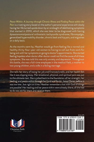 Peace Within: A Journey through Chronic Illness and Finding Peace within the Pain is a riveting story based on the author's personal experience with slowly having her life turned upside down by an onslaught of debilitating symptoms that started in 2010, which she was later to be diagnosed with having dysautonomia/postural orthostatic tachycardia syndrome, fibromyalgia, generalized hypermobility disorder, chronic back and hip pain, and migraines on a daily basis. As the months went by, Heather would go from feeling like a normal and healthy thirty-four-year-old woman to having to call out from work for being sick with her symptoms or going to doctor's appointments. She started feeling hopeless when doctor after doctor could not find the cause of all these symptoms. She was told this was only anxiety and depression. Throughout this battle, she was a full-time employee in the medical field, a mother to two young children, and a wife in a failing marriage. She tells her story of losing her job and finances/credit, and her health felt like it was slipping away. Her emotional, physical, and spiritual pain was put to the ultimate test. She is jolted back to the foundation of her strength, her healing, and peace within through her Lord and Savior, Jesus Christ, before it was too late...but right on time. Heather remembers that with God all things are possible! Her healing and her peace within were already there; all she had to do was ask for them and receive them. 2