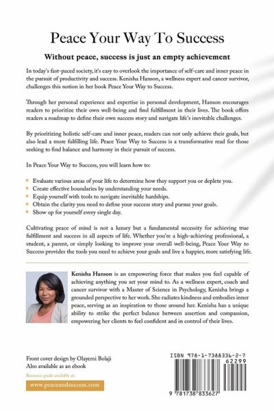 In today's bustling world, it's common to get swept up in the relentless pursuit of productivity and success. However, "Peace Your Way to Success," penned by Kenisha Hanson, offers a refreshing perspective that challenges the status quo. Kenisha, a wellness expert and cancer survivor, draws from her life journey and deep expertise in personal development to guide readers towards an unconventional path to success - one that commences with inner peace. This transformative book provides a roadmap to help you redefine your success story and navigate the inevitable hurdles that life presents. The key message is simple: by placing self-care and inner peace at the forefront of your life, you can not only achieve your goals but also lead a profoundly fulfilling life. Kenisha's practical approach empowers readers to evaluate various life areas to determine what supports them and what depletes them. She emphasizes the importance of creating effective boundaries by understanding your needs and provides tools to tackle inevitable challenges. As you embrace self-awareness and prioritize self-care, clarity emerges, allowing you to move confidently toward your aspirations. The book resonates with those seeking balance and harmony in their quest for success, whether they are high-achieving professionals, students, parents, or simply individuals looking to enhance their overall well-being. It's about discovering your true self, nurturing inner peace, and redefining what success means to you. This is your guide to a life filled with purpose, happiness, and true success. Kenisha Hanson's journey from cancer survivor to wellness expert has fueled her passion for helping others. Her story, filled with resilience and personal transformation, shines through these pages. Hanson understands that life's relentless pace and distractions can make us lose sight of what truly matters, often at the cost of our well-being. This book provides a practical and actionable plan to regain your focus, redefine your goals, and live a life that truly aligns with your peace and happiness. It's a guide for those who've been pushed to the brink, who've realized that relentless productivity doesn't necessarily translate to success or fulfillment. It's for those who want to create better balance in their lives, prioritize self-care, and journey towards true success by their own standards. "Peace Your Way to Success" is an invitation to reflect, prioritize, and act, helping you to align your life with your inner peace, and ultimately achieve the success and fulfilment you've always desired