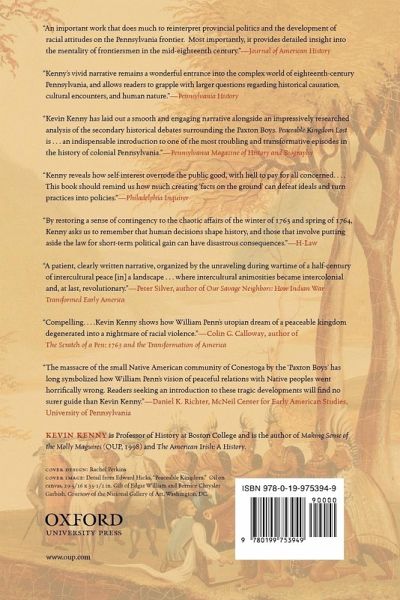 William Penn established Pennsylvania in 1682 as a "holy experiment" in which Europeans and Indians could live together in harmony. In this book, historian Kevin Kenny explains how this Peaceable Kingdom--benevolent, Quaker, pacifist--gradually disintegrated in the eighteenth century, with disastrous consequences for Native Americans. Kenny recounts how rapacious frontier settlers, most of them of Ulster extraction, began to encroach on Indian land as squatters, while William Penn's sons cast off their father's Quaker heritage and turned instead to fraud, intimidation, and eventually violence during the French and Indian War. In 1763, a group of frontier settlers known as the Paxton Boys exterminated the last twenty Conestogas, descendants of Indians who had lived peacefully since the 1690s on land donated by William Penn near Lancaster. Invoking the principle of "right of conquest," the Paxton Boys claimed after the massacres that the Conestogas' land was rightfully theirs. They set out for Philadelphia, threatening to sack the city unless their grievances were met. A delegation led by Benjamin Franklin met them and what followed was a war of words, with Quakers doing battle against Anglican and Presbyterian champions of the Paxton Boys. The killers were never prosecuted and the Pennsylvania frontier descended into anarchy in the late 1760s, with Indians the principal victims. The new order heralded by the Conestoga massacres was consummated during the American Revolution with the destruction of the Iroquois confederacy. At the end of the Revolutionary War, the United States confiscated the lands of Britain's Indian allies, basing its claim on the principle of "right of conquest." Based on extensive research in eighteenth-century primary sources, this engaging history offers an eye-opening look at how colonists--at first, the backwoods Paxton Boys but later the U.S. government--expropriated Native American lands, ending forever the dream of colonists and Indians living together in peace.