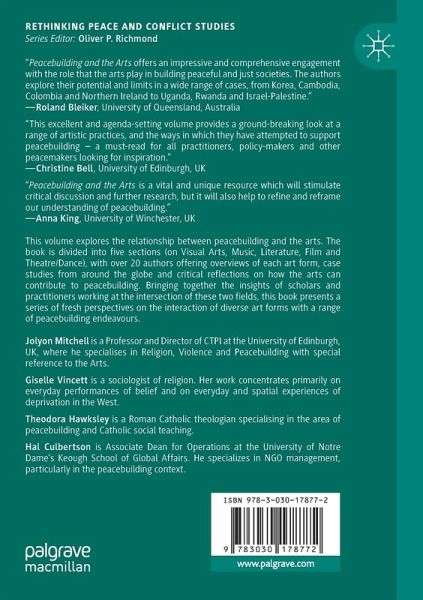 "Peacebuilding and the Arts offers an impressive and impressively comprehensive engagement with the role that visual art, music, literature, film and theatre play in building peaceful and just societies. Without idealizing the role of the arts, the authors explore their potential and limits in a wide range of cases, from Korea, Cambodia, Colombia and Northern Ireland to Uganda, Rwanda, South Africa and Israel-Palestine."Roland Bleiker, Professor of International Relations, University of Queensland, Australia, and author of Aesthetics and World Politics and Visual Global Politics