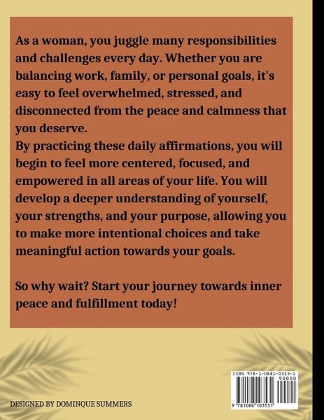 Introducing "180 Days of Affirmations for Inner Harmony, Peace, Clarity, and Being Calm," a transformative guide for women seeking to cultivate a sense of inner balance and tranquility in their lives. This book offers a comprehensive collection of 180 daily affirmations that are specifically tailored to help women find inner peace, clarity, and calm in their daily lives. These affirmations are designed to be practiced for 180 consecutive days, helping readers develop a consistent and powerful habit of positive self-talk. Each daily affirmation focuses on a particular aspect of inner harmony, peace, clarity, and being calm, such as trusting in one's intuition, releasing stress, finding purpose, and embracing the present moment. These affirmations are accompanied by journal prompts that deepen the reader's engagement with the practice. Whether you're dealing with anxiety, stress, or just seeking a greater sense of calm and inner balance, "180 Days of Affirmations for Inner Harmony, Peace, Clarity, and Being Calm" is the perfect guide to help you find your center and cultivate a positive mindset. With consistent practice, these affirmations will help you rewire your brain, transform your thoughts, and ultimately live a more harmonious, peaceful, and fulfilling life.