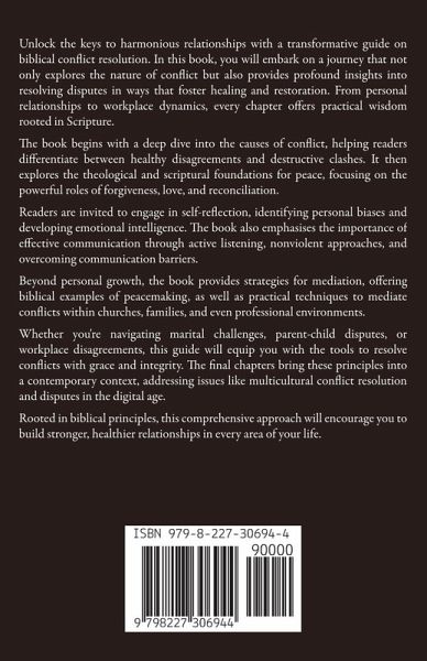 Unlock the keys to harmonious relationships with a transformative guide on biblical conflict resolution. In this book, you will embark on a journey that not only explores the nature of conflict but also provides profound insights into resolving disputes in ways that foster healing and restoration. From personal relationships to workplace dynamics, every chapter offers practical wisdom rooted in Scripture. The book begins with a deep dive into the causes of conflict, helping readers differentiate between healthy disagreements and destructive clashes. It then explores the theological and scriptural foundations for peace, focusing on the powerful roles of forgiveness, love, and reconciliation. Readers are invited to engage in self-reflection, identifying personal biases and developing emotional intelligence. The book also emphasises the importance of effective communication through active listening, nonviolent approaches, and overcoming communication barriers. Beyond personal growth, the book provides strategies for mediation, offering biblical examples of peacemaking, as well as practical techniques to mediate conflicts within churches, families, and even professional environments. Whether you're navigating marital challenges, parent-child disputes, or workplace disagreements, this guide will equip you with the tools to resolve conflicts with grace and integrity. The final chapters bring these principles into a contemporary context, addressing issues like multicultural conflict resolution and disputes in the digital age. Rooted in biblical principles, this comprehensive approach will encourage you to build stronger, healthier relationships in every area of your life.