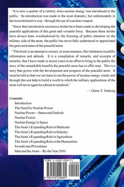 "It is now a quarter of a century since nuclear energy was introduced to the public. Its introduction was made in the most dramatic, but unfortunately in the most destructive way - through the use of a nuclear weapon. "Since that introduction enormous strides have been made in developing the peaceful applications of this great and versatile force. Because these strides have always been overshadowed by the focusing of public attention on the military side of the atom, the public has never fully understood or appreciated the gains and status of the peaceful atom. "This book is an attempt to correct, in some measure, this imbalance in public information and attitude. It is a compilation of remarks, and excerpts of remarks, that I have made in recent years in an effort to bring to the public the story of the remarkable benefits the peaceful atom has to offer man. This is a story that grows with the development and progress of the peaceful atom. It must be told so that we can learn to use the power of nuclear energy wisely and through this use help to build a world in which the military applications of the atom will never again be a threat to mankind." --- Glenn T. Seaborg Contents: Introduction The Need for Nuclear Power Nuclear Power---Status and Outlook Nuclear Fusion Nuclear Energy in Space The Atom's Expanding Role in Medicine The Atom's Expanding Role in Industry The Atom's Expanding Role in Agriculture The Atom's Expanding Role in the Humanities Swords into Plowshares Man and the Atom---By the Year 2000