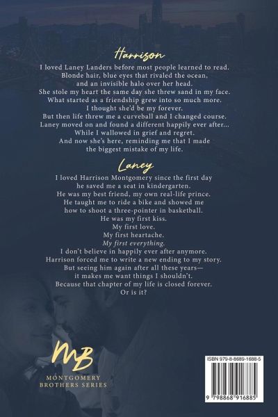 Harrison I loved Laney Landers before most people learned to read. Blonde hair, blue eyes that rivaled the ocean, and an invisible halo over her head. She stole my heart the same day she threw sand in my face. What started as a friendship grew into so much more. I thought she'd be my forever. But then life threw me a curveball and I changed course. Laney moved on and found a different happily ever after... While I wallowed in grief and regret. And now she's here, reminding me that I made the biggest mistake of my life. Laney I loved Harrison Montgomery since the first day he saved me a seat in kindergarten. He was my best friend, my own real-life prince. He taught me to ride a bike and showed me how to shoot a three-pointer in basketball. He was my first kiss. My first love. My first heartache. My first everything. I don't believe in happily ever after anymore. Harrison forced me to write a new ending to my story. But seeing him again after all these years-it makes me want things I shouldn't. Because that chapter of my life is closed forever. Or is it? **This is book 2 in the Montgomery Brothers Series. Each one can be read as a complete standalone. A HEA is guaranteed!** Montgomery Brothers Series: Legacy Peacekeeper Rebel