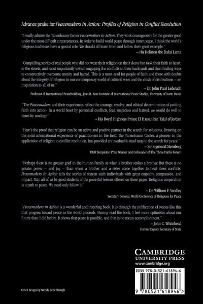Part I. Introduction Richard C. Holbrooke: 1. The peacemakers in action Tanenbaum Center for Interreligious Understanding Part II. Case Studies: 2. Peasant power Jose Alas 3. Men who walked the street The Rev Dr Roy Magee and Father Alex Reid 4. Would you shoot me, you idiot? Father Ivo Markovic 5. The Cybermonk Father Sava Janjic 6. The Elder Dr Ephraim Isaac 7. The power of ritual the Rev. Dr William Lowrey 8. The nonviolent deputy Minister of Defense Nozizwe Madlala-Routledge 9. Warriors and brothers Imam Muhammad Ashafa and The Rev. James Wuye 10. The power of organization Alimamy Koroma 11. Israel and Palestine, a history: I am Palestinian, Arab, Christian and Israeli Abuna Elias Chacour The Settler who Spoke with Arafat Rabbi Menachem Froman An Open House Yehezkel Landau 12. Underground woman Sakena Yacoobi and the Afghan Institute of Learning 13. Toward a Zone of Peace The Rev Benny Giay Part III. Conclusion: 14. Religion, Violent Conflict and peacemaking Dr David Little Appendix Notes Bibliography Index.