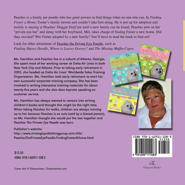 Peaches is a family pet poodle who has great powers to find things when no one else can. In Finding Foster a Home, Foster's family moved and couldn't take him along. He is put up for adoption and luckily is staying at Peaches' Doggie DayCare until a new family can be found. Peaches puts on her "private eye hat" and along with her boyfriend, Mel, takes charge of finding Foster a new home. Did they succeed? Was Foster adopted by a new family? You'll have to read the book to find out! Look for other adventures of Peaches the Private Eye Poodle, such as Finding Dipsey Doodle, Where is Loosey Goosey? and The Missing Muffin Caper. Ms. Hamilton and Peaches live in a suburb of Atlanta, Georgia. She spent most of her working career at Delta Air Lines in both New York City and Atlanta. Prior to taking early retirement in 2003, she headed up Delta Air Lines' Worldwide Sales Training Organization. Ms. Hamilton took early retirement to start her own successful corporate training company. She has been involved in writing interactive training materials for about twenty-five years and she also does keynote speaking on customer service. Ms. Hamilton has always wanted to venture into writing children's books and thought this might be the right time. When taking Peaches for walks, children are always running up to her because Peaches is so cute (said by a biased parent), so Ms. Hamilton thought she would put the two together and Peaches The Private Eye Poodle was born. Publisher's website: http://www.strategicpublishinggroup.com/title/ PeachesThePrivateEyePoodle-FindingFosterAHome.html