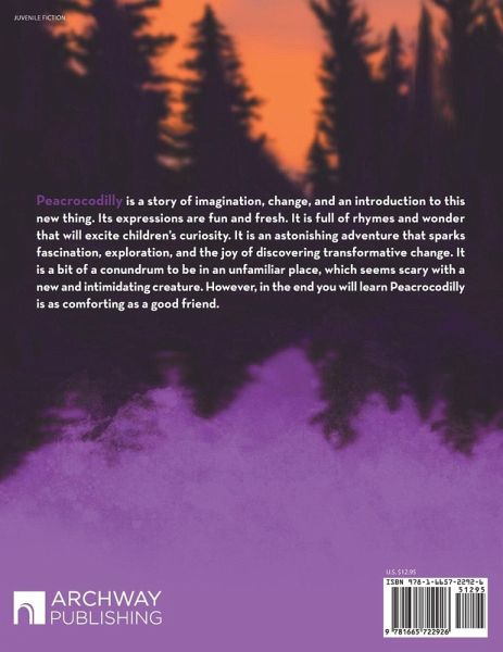 Peacrocodilly is a story of imagination, change, and an introduction to this new thing. Its expressions are fun and fresh. It is full of rhymes and wonder that will excite children's curiosity. It is an astonishing adventure that sparks fascination, exploration, and the joy of discovering transformative change. It is a bit of a conundrum to be in an unfamiliar place, which seems scary with a new and intimidating creature. However, in the end you will learn Peacrocodilly is as comforting as a good friend.