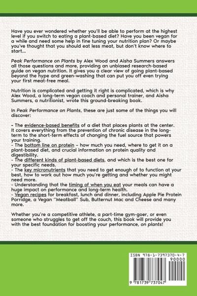 GET YOUR PLANT-BASED NUTRITION RIGHT! So many people either give up on a plant-based diet, or feel they're not performing at their best because they don't have the right information from the start. They've been told "You can get all your protein from broccoli!" or "Just eat more beans and you'll be fine!" - and they've found they're not actually fine. Have you ever wondered whether you'll be able to perform at the highest level if you switch to eating a plant-based diet? Have you been vegan for a while and need some help in fine tuning your nutrition plan? Or maybe you've thought that you should eat less meat, but don't know where to start... Peak Performance on Plants by Alex Wood and Aisha Summers answers all those questions and more, providing an unbiased research-based guide on vegan nutrition. It gives you a clear view of going plant-based beyond the hype and green-washing that can put you off even trying your first meat-free meal. Peak performance means that you are functioning at your best, no matter what you're doing - from high level athleticism, where you're counting every gram of protein that you consume, to living your healthiest life doing the things you love with the people you love. At the foundation of it all is the food that you eat. Getting it right is complicated, which is why Alex Wood, a long-term vegan coach and personal trainer, and Aisha Summers, a nutritionist, wrote this ground-breaking book. In Peak Performance on Plants, these are just some of the things you will discover: The evidence-based benefits of a diet that places plants at the center. It covers everything from the prevention of chronic disease in the long-term to the short-term effects of changing the fuel source that powers your training. The bottom line on protein - how much you need, where to get it on a plant-based diet, and crucial information on protein quality and digestibility. The different kinds of plant-based diets, and which is the best one for your specific needs. The key micronutrients that you need to get enough of to function at your best, how to work out how much you're getting and whether you might need more. Understanding that the timing of when you eat your meals can have a huge impact on performance and long-term health. Vegan recipes for breakfast, lunch and dinner, including Apple Pie Protein Porridge, a Vegan "Meatball" Sub, Butternut Mac and Cheese and many more. Whether you're a competitive athlete, a part-time gym-goer, or even someone who struggles to get off the couch, this book will provide you with the best foundation for boosting your performance, on plants! If you are thinking of going plant-based, or if you are already there, you need to read this now.