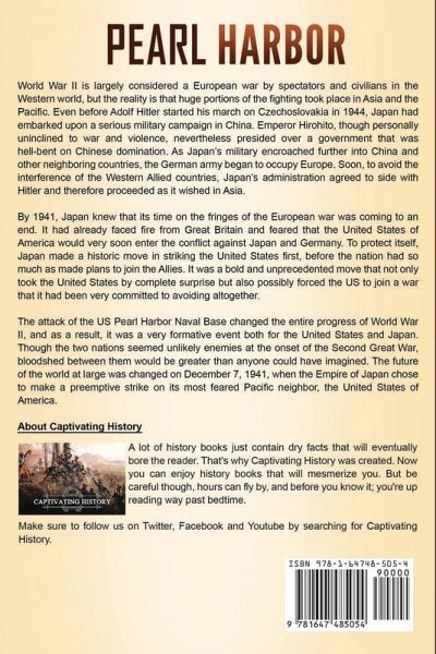 If you want to discover the captivating history of Pearl Harbor, then keep reading... The attack of the US Pearl Harbor Naval Base changed the entire progress of World War II, and as a result, it was a very formative event both for the United States and Japan. Though the two nations seemed unlikely enemies at the onset of the Second Great War, bloodshed between them would be greater than anyone could have imagined. The future of the world at large was changed on December 7, 1941, when the Empire of Japan chose to make a preemptive strike on its most feared Pacific neighbor, the United States of America. In Pearl Harbor: A Captivating Guide to the Surprise Military Strike by the Imperial Japanese Navy Air Service that Caused the United States of America's Formal Entry into World War II, you will discover topics such as The Pearl Harbor Naval Base, Pre-1941 Post-World War I Pearl Harbor Post-WWI Japan The Second Sino-Japanese War War in Europe The Occupation of Iceland Japan Contemplates War The Pearl Harbor Attack Immediate Aftermath The United States Goes to War America’s Military Prepares for War Wartime in the United States of America The Tule Lake Relocation Camp Italy Switches Sides D-Day President Roosevelt Dies The B-29 Superfortress Iwo Jima and Okinawa The Bombardment of Japan The Manhattan Project The Bombing of Hiroshima The Bombing of Nagasaki Japan Surrenders Post-War Occupation of Japan And much, much more! So if you want to learn more about Pearl Harbor, then scroll up and click the "add to cart" button!