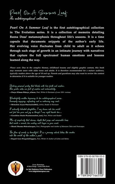 Pearl On A Summer Leaf; An autobiographical collection (The Expanded Edition) Pearl On A Summer Leaf is the first autobiographical collection in The Evolution Series. It is a collection of memoirs detailing Reena Doss' metamorphosis throughout life's seasons. It is a time capsule that documents snippets of the author's early life. Her evolving voice fluctuates from child to adult as it echoes through each stage of growth in an intimate journey with narratives that capture the full spectrum of human emotions and lessons learned along the way. Please note: Due to the complex themes, childhood trauma and slightly graphic content, this book may resonate more with older teens and adults. It is therefore recommended for a mature audience, typically readers above the age of 18 and up. Parents and guardians may also want to review the content to determine if it is suitable for younger readers.