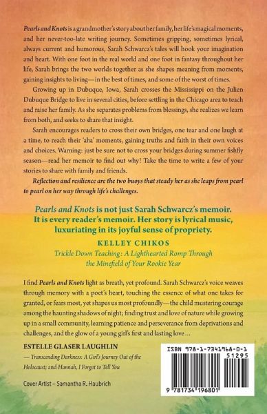 Pearls and Knots is a grandmother’s story about her family, her life’s magical moments, and her never-too-late writing journey. Sometimes gripping, sometimes lyrical, always current and humorous, Sarah Schwarcz’s tales will hook your imagination and heart. With one foot in the real world and one foot in fantasy throughout her life, Sarah brings the two worlds together as she shapes meaning from moments, gaining insights to living—in the best of times, and some of the worst of times. Growing up in Dubuque, Iowa, Sarah crosses the Mississippi on the Julien Dubuque Bridge to live in several cities, before settling in the Chicago area to teach and raise her family. As she separates problems from blessings, she realizes we learn from both, and seeks to share that insight. Sarah encourages readers to cross their own bridges, one tear and one laugh at a time, to reach their ‘aha’ moments, gaining truths and faith in their own voices and choices. Warning: just be sure not to cross your bridges during summer fishfly season—read her memoir to find out why! Take the time to write a few of your stories to share with family and friends. Reflection and resilience are the two buoys that steady her as she leaps from pearl to pearl on her way through life’s challenges.