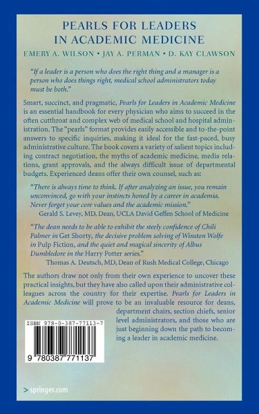 Humorous and easily accessible, "Pearls for Leaders in Academic Medicine" is an invaluable resource for deans, department chairs, section chiefs and other senior level medical school administrators. However, it also provides insight for those considering a career as a leader in academic medicine, allowing them the benefit of advice from experienced leaders.