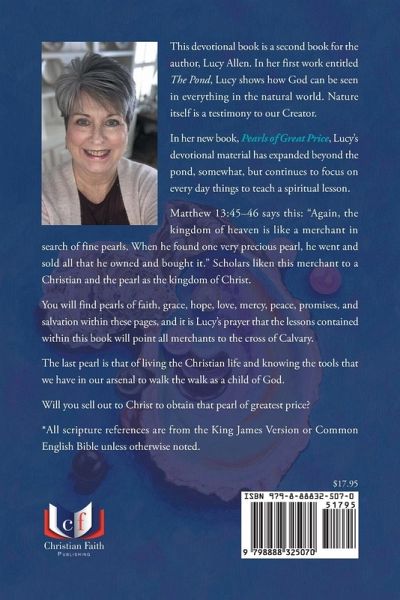 This devotional book is a second book for the author, Lucy Allen. In her first work entitled The Pond, Lucy shows how God can be seen in everything in the natural world. Nature itself is a testimony to our Creator. In her new book, Pearls of Great Price, Lucy's devotional material has expanded beyond the pond, somewhat, but continues to focus on every day things to teach a spiritual lesson. Matthew 13:45-46 says this: "Again, the kingdom of heaven is like a merchant in search of fine pearls. When he found one very precious pearl, he went and sold all that he owned and bought it." Scholars liken this merchant to a Christian and the pearl as the kingdom of Christ. You will find pearls of faith, grace, hope, love, mercy, peace, promises, and salvation within these pages, and it is Lucy's prayer that the lessons contained within this book will point all merchants to the cross of Calvary. The last pearl is that of living the Christian life and knowing the tools that we have in our arsenal to walk the walk as a child of God. Will you sell out to Christ to obtain that pearl of greatest price? *All scripture references are from the King James Version or Common English Bible unless otherwise noted.
