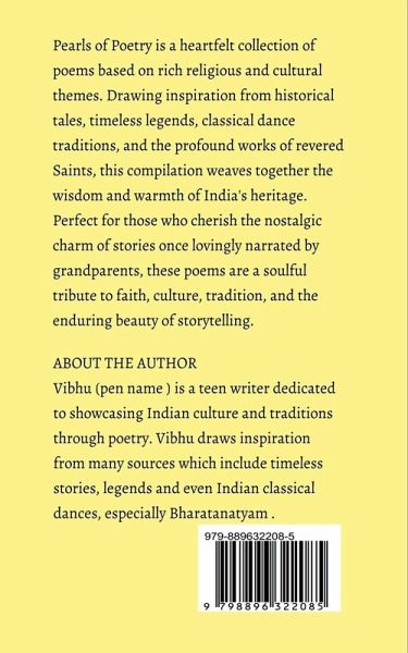 Pearls of Poetry is a heartfelt collection of poems based on rich religious and cultural themes. Drawing inspiration from historical tales, timeless legends, classical dance traditions, and the profound works of revered Saints, this compilation weaves together the wisdom and warmth of India's heritage. Perfect for those who cherish the nostalgic charm of stories once lovingly narrated by grandparents, these poems are a soulful tribute to faith, culture, tradition, and the enduring beauty of storytelling.