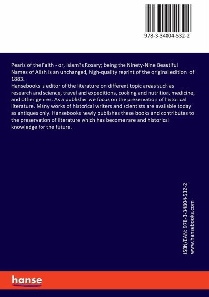 Pearls of the Faith - or, Islam's Rosary; being the Ninety-Nine Beautiful Names of Allah is an unchanged, high-quality reprint of the original edition of 1883.Hansebooks is editor of the literature on different topic areas such as research and science, travel and expeditions, cooking and nutrition, medicine, and other genres. As a publisher we focus on the preservation of historical literature. Many works of historical writers and scientists are available today as antiques only. Hansebooks newly publishes these books and contributes to the preservation of literature which has become rare and historical knowledge for the future.