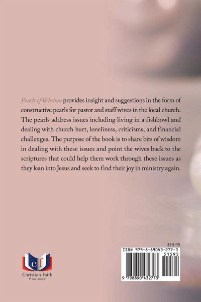 Pearls of Wisdom provides insight and suggestions in the form of constructive pearls for pastor and staff wives in the local church. The pearls address issues including living in a fishbowl and dealing with church hurt, loneliness, criticisms, and financial challenges. The purpose of the book is to share bits of wisdom in dealing with these issues and point the wives back to the scriptures that could help them work through these issues as they lean into Jesus and seek to find their joy in ministry again. 2