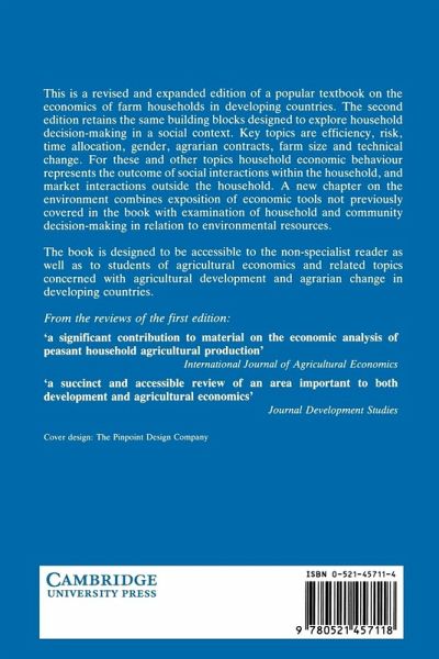 This is a revised and expanded edition of a popular textbook on the economics of farm households in developing countries. The second edition retains the same building blocks designed to explore household decision-making in a social context. Key topics are efficiency, risk, time allocation, gender, agrarian contracts, farm size and technological change. For these and other topics, household economic behavior represents the outcome of social interactions within the household, and market interactions outside the household. A new chapter on the environment combines exposition of economic tools not previously covered in the book with examination of household and community decision-making in relation to environmental resources.