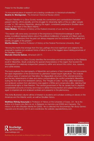 "Matthias Assunção's book is a classic that was first published in German and has been circulating among specialists through English and Portuguese articles for over 20 years before being published in Portuguese in 2018. The original research, which is absolutely groundbreaking in the field of agrarian history, environmental history and slavery in the 19th century, has opened up new windows of analysis for the political and cultural history of the period, based on social history. The book in English incorporates much of the new historiography on these topics. The timeliness of the research carried out in the 1980s is absolutely impressive, connecting the past and present of peasant society and culture in Maranhão. Peasant Rebellion in a Slave Society reveals the connections and contradictions between peasant identity, ethnic plurality and the struggle for citizenship rights of the so-called "people of color" in 19th century Maranhão, placing the region, considered peripheral in Brazilian slave society, at the heart of the Black Atlantic."