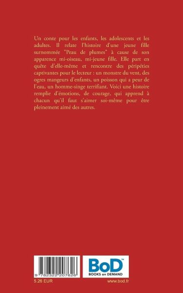 Un conte pour les enfants, les adolescents et les adultes. Il relate l'histoire d'une jeune fille surnommée "Peau de plumes" à cause de son apparence mi-oiseau, mi-jeune fille. Elle part en quête d'elle-même et rencontre des péripéties captivantes pour le lecteur : un monstre du vent, des ogres mangeurs d'enfants, un poisson qui a peur de l'eau, un homme-singe terrifiant. Voici une histoire remplie d'émotions, de courage, qui apprend à chacun qu'il faut s'aimer soi-même pour être pleinement aimé des autres.