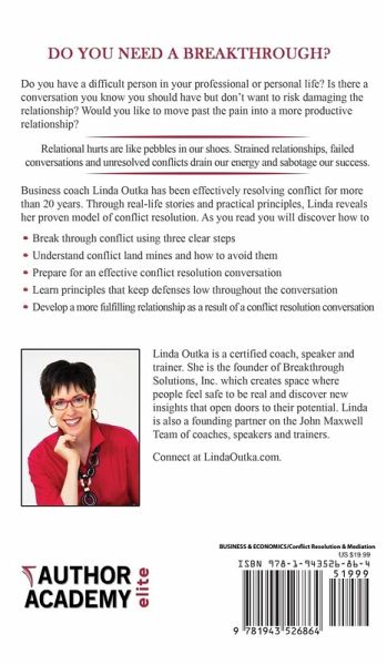 Do you need a breakthrough? Do you have a difficult person in your professional or personal life? Is there a conversation you know you should have but don’t want to risk damaging the relationship? Would you like to move past the pain into a more productive relationship? Relational hurts are like pebbles in our shoes. Strained relationships, failed conversations and unresolved conflicts drain our energy and sabotage our success. Business coach Linda Outka has been effectively resolving conflict for more than 20 years. Through real-life stories and practical principles, Linda reveals her proven model of conflict resolution. As you read you will discover how to: • Break through conflict using three clear steps • Understand conflict land mines and how to avoid them • Prepare for an effective conflict resolution conversation • Learn principles that keep defenses low throughout the conversation • Develop a more fulfilling relationship as a result of a conflict resolution conversation