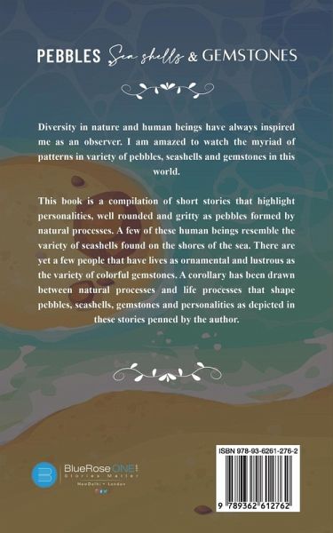 Diversity in nature and human beings have always inspired me as an observer. I am amazed to watch the myriad of patterns in variety of pebbles, seashells and gemstones in this world. This book is a compilation of short stories that highlight personalities, well rounded and gritty as pebbles formed by natural processes. A few of these human beings resemble the variety of seashells found on the shores of the sea. There are yet a few people that have lives as ornamental and lustrous as the variety of colourful gemstones. A corollary has been drawn between natural processes and life processes that shape pebbles, seashells, gemstones and personalities as depicted in these stories penned by the author.