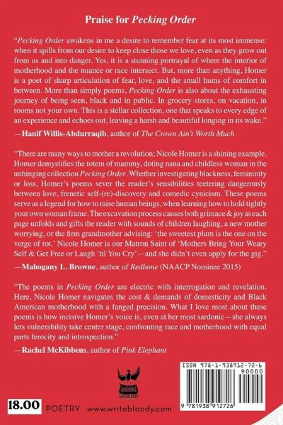 Nicole Homer's first full-length poetry collection, Pecking Order, is an unflinching look at how race and gender politics play out in the domestic sphere. Homer challenges the notion of family by forcing the reader to examine how race, race performance, and colorism impact motherhood immediately and from generation to generation. In a world where race and color often determine treatment, the home should be sanctuary, but often is not. Homer's poems question the construction of racial identity and how familial love can both challenge and bolster that construction. Her poems range from the intimate details of motherhood to the universal experiences of parenting; the dynamics of multiracial families to parenting black children; and the ingrained social hierarchy which places the black mother at the bottom. Homer forces us to reckon with the truth that no one-not even the mother-is unbiased.