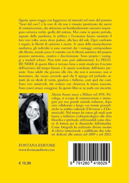 Questa opera viaggia con leggerezza ed intensità nel mare del pensiero "fuori dal coro"; è la voce di chi non è rimasto ipnotizzato dai mezzi di comunicazione, che attraverso un bombardamento ossessivo impongono un’unica verità, quella del sistema. Mai come in questo periodo, segnato dalla pandemia, la politica e l’economia hanno mostrato il loro vero volto, senza alcun pudore, alla luce del sole. Ogni confronto è negato, la libertà di opinione è morta. A causa della manipolazione mediatica, gli individui si sono convinti che i vantaggi corrispondano alla libertà, avendo perso il contatto con la libertà autentica del proprio pensiero autonomo, creativo e discriminante. Sono proprio i vantaggi a renderli schiavi. Non tutti sono però addormentati. Le PECORE NERE di questo libro si trovano forse a metà strada tra il recinto dell’universo del tempo lineare e lo spazio sconfinato dell’eterno presente. Sono adulti che giocano alla vita, che non si annoiano, non si lamentano, che vanno cercando quel che li appaga nel profondo, attratti da un ideale di verità, giustizia e bellezza, costi quel che costi. Sono voci autorevoli, che svelano con chiarezza la trama nascosta. Sono esseri umani coraggiosi. In questo libro se ne parla con sincerità.