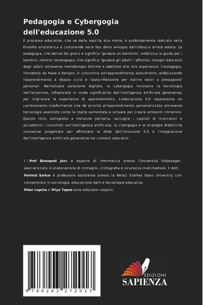 Il processo educativo, che va dalla nascita alla morte, è profondamente radicato nella filosofia aristotelica e comprende varie fasi dello sviluppo dall'infanzia all'età adulta. La pedagogia, che deriva dal greco e significa "guidare un bambino", enfatizza la guida per i bambini, mentre l'andragogia, che significa "guidare gli adulti", affronta i bisogni educativi degli adulti attraverso metodologie distinte e adattate alle loro esperienze. L'eutagogia, introdotta da Hase e Kenyon, si concentra sull'apprendimento auto-diretto, enfatizzando l'apprendimento a doppio ciclo e l'auto-riflessione per nutrire valori e presupposti personali. Nell'attuale panorama digitale, la cybergogia incorpora la tecnologia nell'istruzione, influenzata in modo significativo dall'intelligenza artificiale generativa, per migliorare le esperienze di apprendimento. L'educazione 5.0 rappresenta un cambiamento trasformativo che dà priorità all'apprendimento personalizzato attraverso tecnologie avanzate come la realtà aumentata e virtuale per creare ambienti immersivi. Questo libro, sottoposto a revisione paritaria, raccoglie i capitoli di ricercatori e accademici, incentrati sull'intelligenza artificiale, la cibergogia e le strategie didattiche innovative progettate per affrontare le sfide dell'istruzione 5.0 e l'integrazione dell'intelligenza artificiale generativa nei contesti educativi.