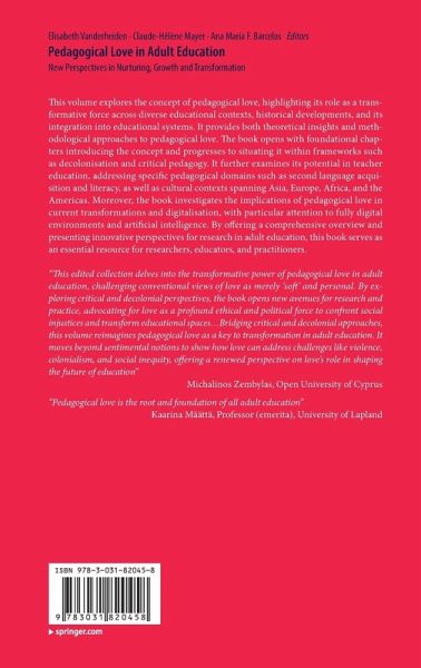 This volume explores the concept of pedagogical love, highlighting its role as a transformative force across diverse educational contexts, historical developments, and its integration into educational systems. It provides both theoretical insights and methodological approaches to pedagogical love. The book opens with foundational chapters introducing the concept and progresses to situating it within frameworks such as decolonisation and critical pedagogy. It further examines its potential in teacher education, addressing specific pedagogical domains such as second language acquisition and literacy, as well as cultural contexts spanning Asia, Europe, Africa, and the Americas. Moreover, the book investigates the implications of pedagogical love in current transformations and digitalisation, with particular attention to fully digital environments and artificial intelligence. By offering a comprehensive overview and presenting innovative perspectives for research in adult education, this book serves as an essential resource for researchers, educators, and practitioners.