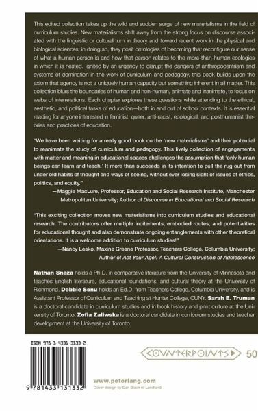 Robert Helfenbein: Preface: Entanglement - Nathan Snaza, Debbie Sonu, Sarah Truman, and Zofia Zaliwska: Introduction: Re-attuning to the Materiality of Education - Elizabeth St. Pierre: Curriculum for New Material, New Empirical Inquiry - Linda Knight: Playgrounds as Sites of Radical Encounters: Mapping Material, Affective, Spatial, and Pedagogical Collisions - Nathan Snaza and Debbie Sonu: Bodies, Borders, and the Politics of Attention - Elizabeth de Freitas and Francesca Ferrarra: Matter, Movement, and Memory - Stephanie Springgay: Meditating with Bees: Weather Bodies and a Pedagogy of Movement - Walter Gershon: The Sound of Silence: The Material Consequences of Scholarship - Sarah Truman: Intratextual Entanglements: Emergent Pedagogies and the Productive Potential of Texts - Gabe Huddleston: The Zombie in the Room: Using Popular Culture as an Apparatus - Zofia Zaliwska: Moving-Back-Through-A Matter of Research - Mark Helmsing: Life at Large: New Materialisms for a (Re)new(ing) Curriculum of Social Studies Education - Kirsten Robbins: A Matter of Power - Paul Eaton: Multiple Materiality Across Distributed Social Media - Nikki Rotas: Moving Toward Practices That Matter