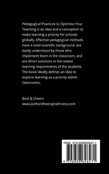 Pedagogical Practices to Optimise Your Teaching is an idea and a conception to make learning a priority for schools globally. Effective pedagogical methods have a solid scientific background, are easily understood by those who implement them in the classroom, and are direct solutions to the stated learning requirements of the students. The book ideally defines an idea to explore learning as a priority within classrooms. Best & Cheers www.authordheerajmehrotra.com