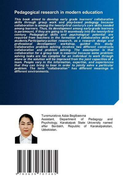 Th s book a med to develop early grade learners' collaborat ve sk lls through group work and play-based pedagogy because collaborat on s among the twenty-f rst century's core sk lls needed among learners. Thus, ts development among early-grade learners s paramount, f they are go ng to f t seamlessly nto the twenty-f rst century. Pedagogical skills and psychological potential are required from teachers in the formation of collaborative skills of students.Part c patory-act on research, as a research des gn and profess onal development workshop, gu ded th s study. Collaborat ve problem solv ng nvolves two d fferent constructs collaborat on and problem solv ng. The assumpt on s that collaborat on for a group task s essent al because some problem-solv ng tasks are too complex for an nd v dual to work through alone or the solut on w ll be mproved from the jo nt capac t es of a team. People vary n the nformat on, expert se, and exper ences that they can br ng to bear n order to jo ntly solve a part cular problem. The term "collaborat on" has d fferent mean ngs n d fferent env ronments.