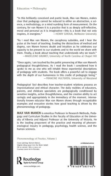 Van Manen's latest book Pedagogical Tact is a true work of art, elevating classroom pedagogy to an unheralded level of fascination, and revealing the committed teacher as a truly gifted and unique professional.