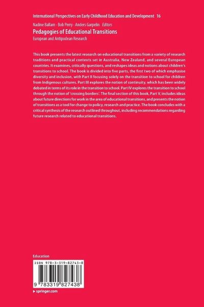 This book presents the latest research on educational transitions from a variety of research traditions and practical contexts set in Australia, New Zealand, and several European countries. It examines, critically questions, and reshapes ideas and notions about children's transitions to school. The book is divided into five parts, the first two of which emphasise diversity and inclusion, with Part II focusing solely on the transition to school for children from Indigenous cultures. Part III explores the notion of continuity, which has been widely debated in terms of its role in the transition to school. Part IV explores the transition to school through the notion of 'crossing borders'. The final section of this book, Part V, includes ideas about future directions for work in the area of educational transitions, and presents the notion of transitions as a tool for change to policy, research and practice. The book concludes with a critical synthesis of the research outlined throughout, including recommendations regarding future research related to educational transitions.