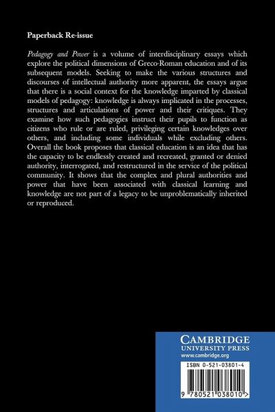 Pedagogy and Power is a volume of interdisciplinary essays which explores the political dimensions of Graeco-Roman education and of its subsequent models. Seeking to make the various structures and discourses of intellectual authority more apparent, the essays argue that there is a social context for the knowledge imparted by classical models of pedagogy. They examine how such pedagogues instruct their pupils to function as citizens who rule or are ruled, privileging certain knowledge over others, and including some individuals while excluding others. Overall the book shows that the complex and plural authorities and power that have been associated with classical learning and knowledge are not part of a legacy to be unproblematically inherited or reproduced.