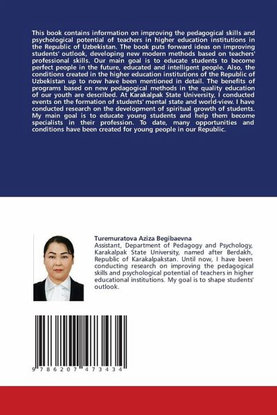 This book contains information on improving the pedagogical skills and psychological potential of teachers in higher education institutions in the Republic of Uzbekistan. The book puts forward ideas on improving students' outlook, developing new modern methods based on teachers' professional skills. Our main goal is to educate students to become perfect people in the future, educated and intelligent people. Also, the conditions created in the higher education institutions of the Republic of Uzbekistan up to now have been mentioned in detail. The benefits of programs based on new pedagogical methods in the quality education of our youth are described. At Karakalpak State University, I conducted events on the formation of students' mental state and world-view. I have conducted research on the development of spiritual growth of students. My main goal is to educate young students and help them become specialists in their profession. To date, many opportunities and conditions have been created for young people in our Republic.