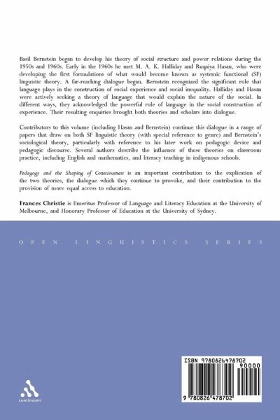 Basil Bernstein began to develop his theory of social structure and power relations during the 1950s and 1960s. Early in the 1960s he met M. A. K. Halliday and Ruqaiya Hasan, who were developing the first formulations of what would become known as systemic functional (SF) linguistic theory. A far-reaching dialogue began. Bernstein recognized the significant role that language plays in the construction of social experience and social inequality. Halliday and Hasan were actively seeking a theory of language that would explain the nature of the social. In different ways, they acknowledged the powerful role of language in the social construction of experience. Their resulting enquiries brought both theories and scholars into dialogue. Contributors to this volume (including Hasan and Bernstein) continue this dialogue in a range of papers that draw on both SF linguistic theory (with special reference to genre) and Bernstein's sociological theory, particularly with reference to his later work on pedagogic device and pedagogic discourse. Several authors describe the influence of these theories on classroom practice, including English and mathematics, and literacy teaching in indigenous schools. Pedagogy and the Shaping of Consciousness is an important contribution to the explication of the two theories, the dialogue which they continue to provoke, and their contribution to the provision of more equal access to education.